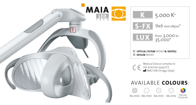 δύο παραβολές, ο οδοντιατρικός φωτισμός "Maia" αποφεύγει την άμεση θέαση των 2 LEDs, δημιουργώντας απόλυτα ομοιόμορφη επιφάνεια προβολής 175 x