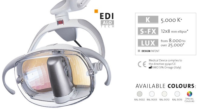 - Το "EDI" μπορεί να τοποθετηθεί σε οποιοδήποτε τύπο οδοντιατρικής μονάδας, στον τοίχο, στην οροφή, στο πάτωμα και σε έναν πόλο, χάρη σε μια πλήρη γραμμή εφαρμογής για οδοντικά φώτα που δημιουργήθηκε από την Faro.