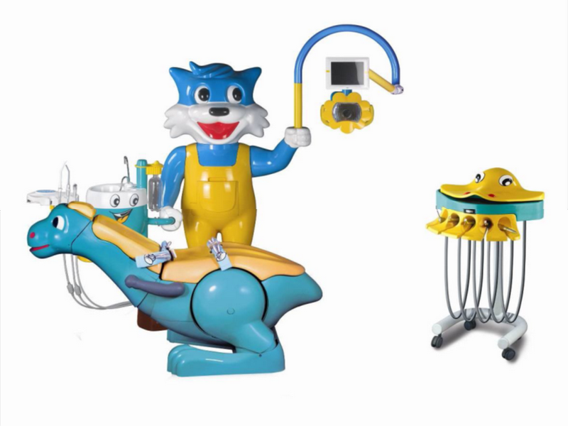 - Ο υπέροχος δεινόσαυρος, η χαμογελαστή γαλάζια γάτα και τα μίνι ψάρια μετατρέπονται με θαυματουργό τρόπο σε οδοντιατρική καρέκλα με πλαϊνό κιβώτιο και δίσκο οργάνων, σε ένα πολύ καινοτόμο σχέδιο.