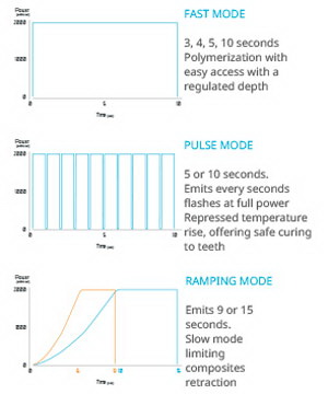 - Ισχύς 2000 mW/cm² (με διάμετρο οπτικού οδηγού 7,5 mm) και μέχρι 3000 mW/cm² (με διάμετρο οπτικού οδηγού 5,5 mm), καθώς και ευρύ φάσμα από 420 έως 480 nm.